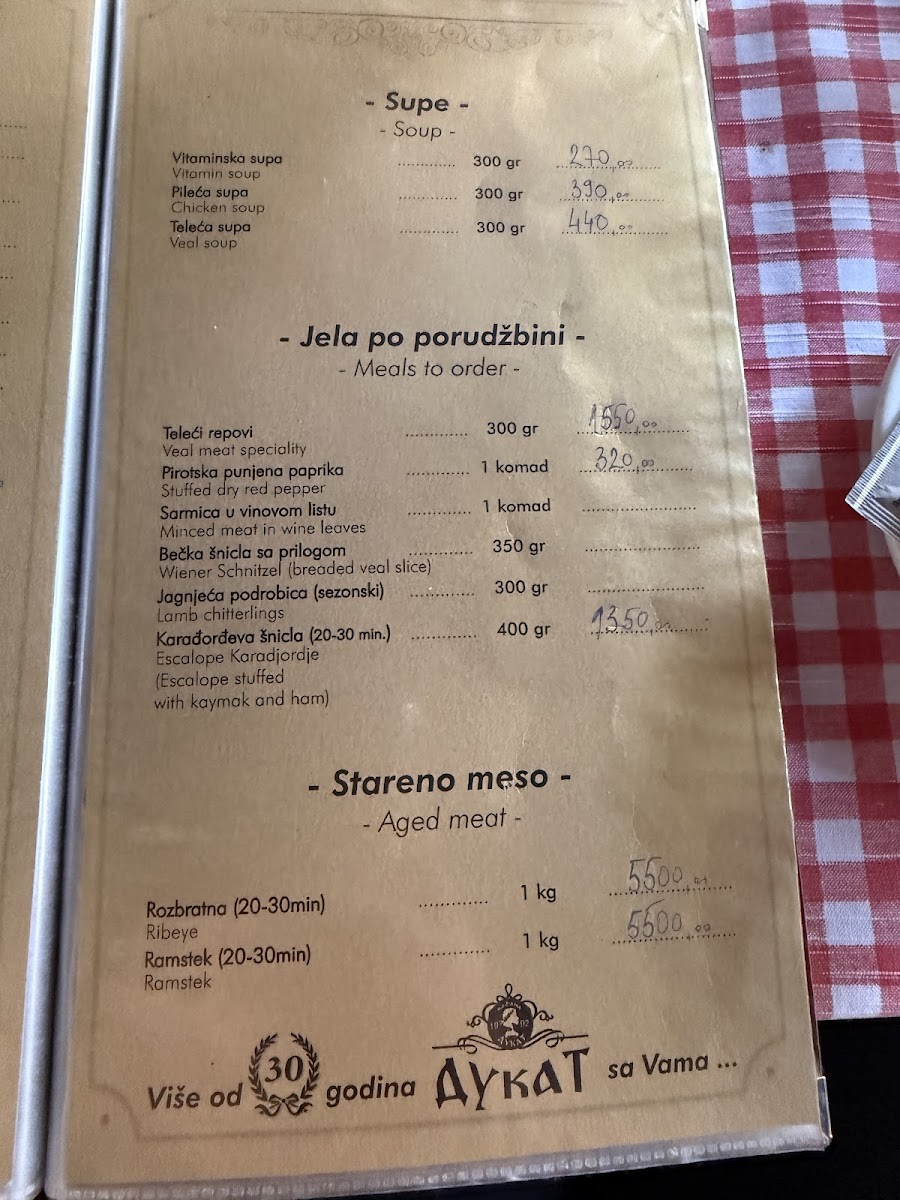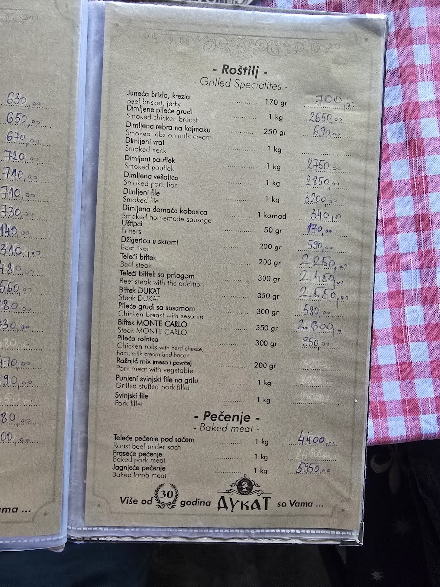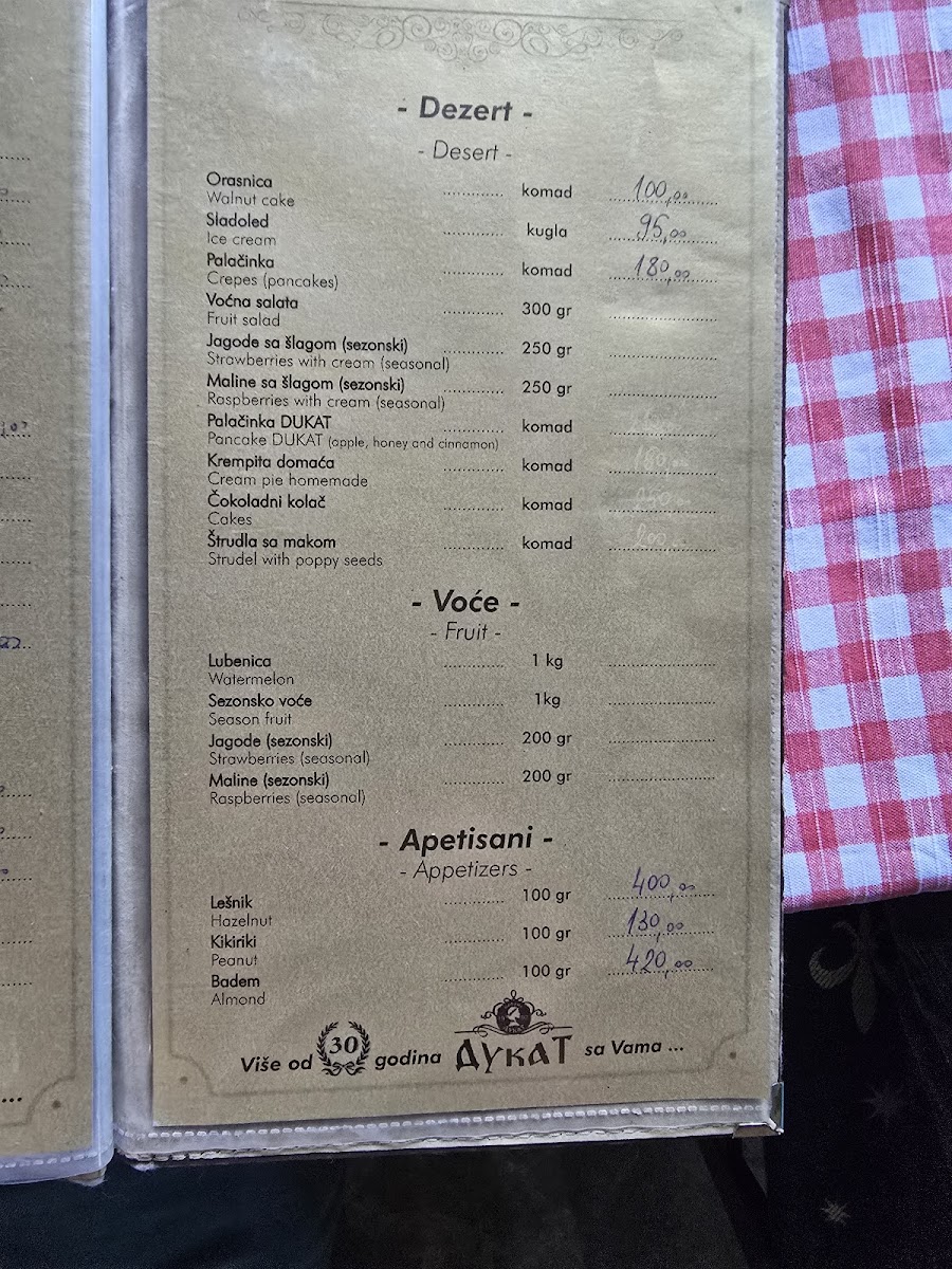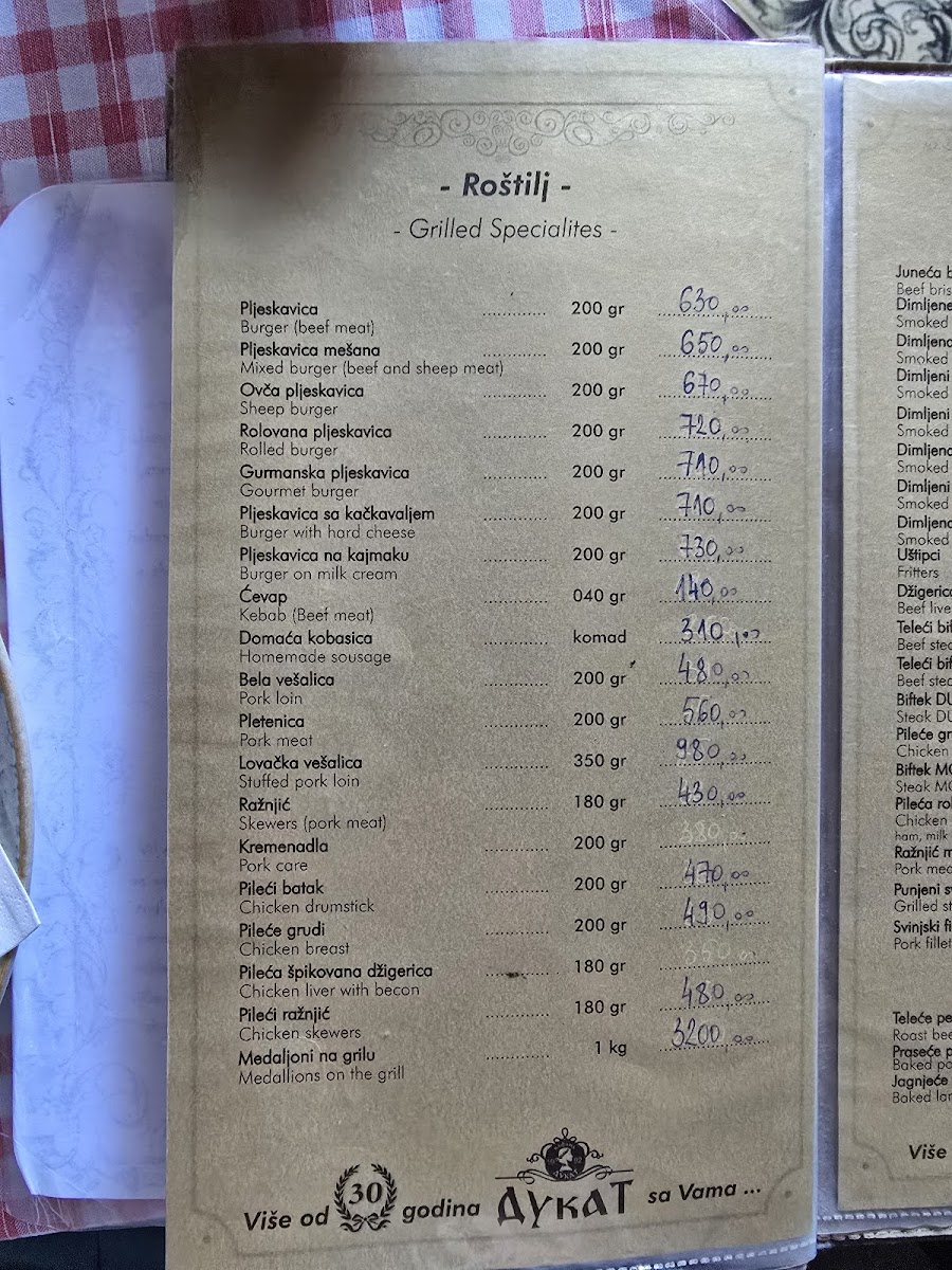 Kafana Dukat Pirot Menu